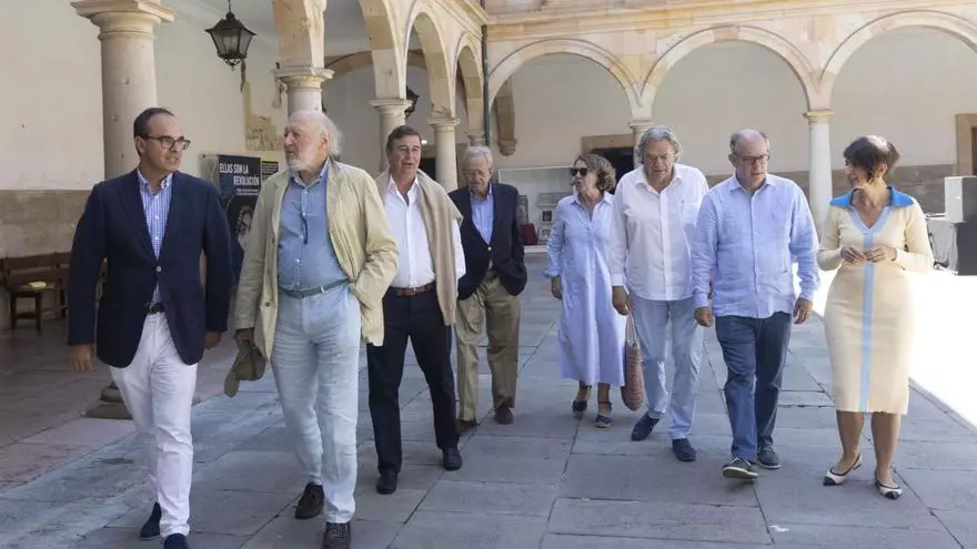 Por la izquierda, Alfredo Martínez Serrano, Alberto Aza, José Laviña, Luis Arias, Aurora Díaz-Rato, Javier Vallaure, Jorge Hevia y Eva Martínez, en el patio del edificio histórico de la Universidad de Oviedo. | Miki López / Marcos Palicio / María José Iglesias, M. J. I. / M. P.