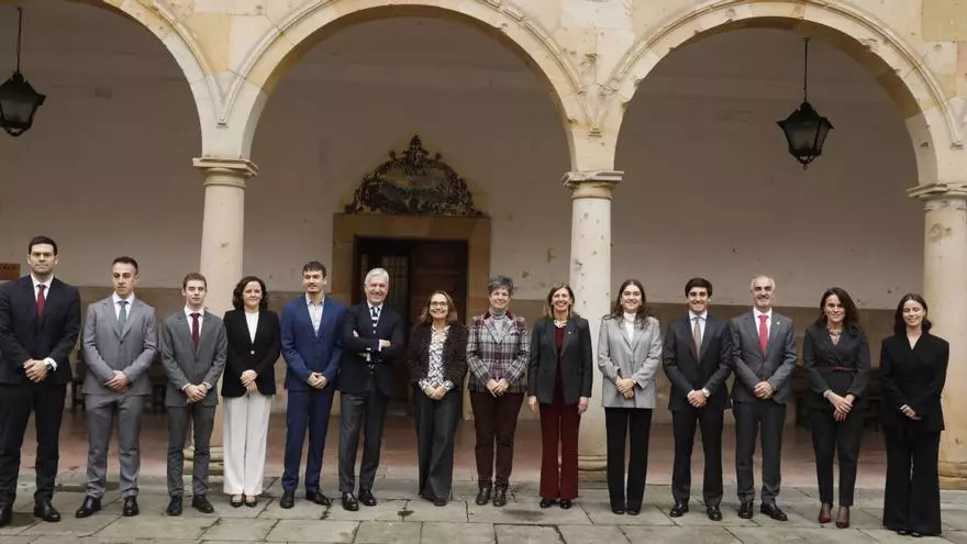Por la izquierda, Roberto Fernández-Jardón, Guillermo Esteban, David Rodríguez, Carmen Vilabrille, Javier Fernández Rodríguez, Carlos Ranera, Carmen Benavides, Susana Luque, Eva Pando, Carla Cifuentes, Javier Fernández Fernández-Nespral, Jaime Reinares, Belén Fraga y Carla Martínez. | FERNANDO RODRÍGUEZ