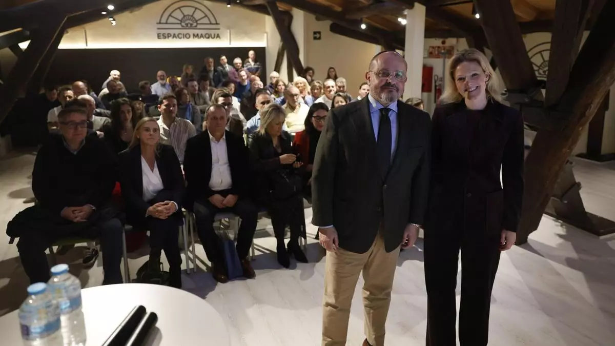 El presidente del PP en Cataluña, Alejandro Fernández, junto a la presidenta del PP en Avilés, Estefanía Rodríguez. / Miki López / LNE