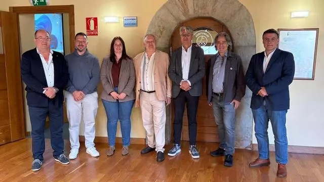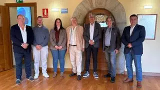 Por la izquierda, Joaquín Fernández, los concejales Ángel Menéndez y Tania Rodríguez, José Luis Murcia, Lluís Tolosa, Joaquín Gálvez y el alcalde, José Luis Fontaniella, ante el auditorio municipal antes del inicio de la jornadas. / D. Álvarez