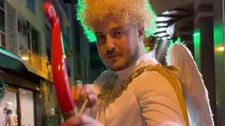 El Cupido cangués, David "Borri", lanza una flecha en plena calle comercial. / R. T. C.