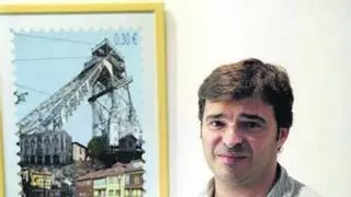 Fermín Santos posa frente al sello donde representa la localidad de Mieres. / j. r. silveira