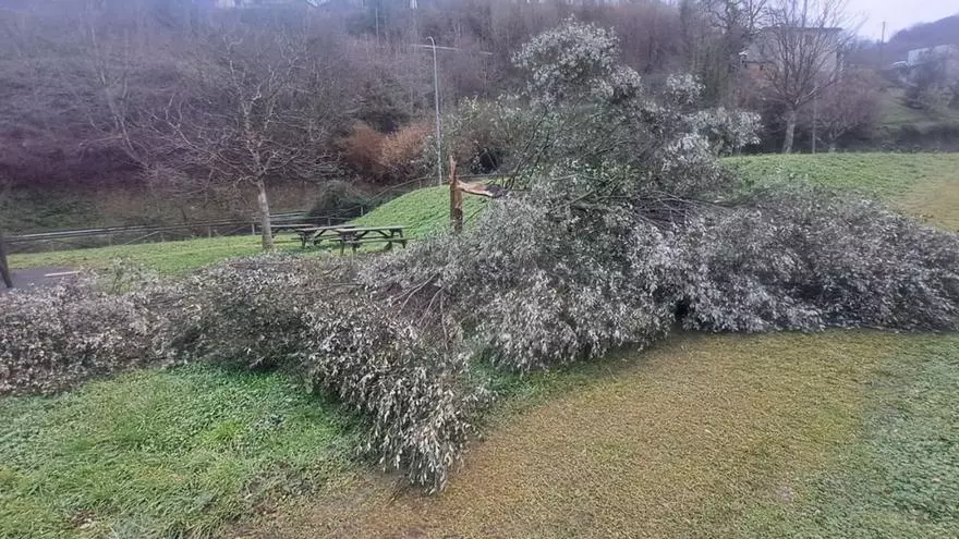Los usuarios del área recreativa de El Carbayón, en el valle de San Juan (Mieres), han visto alterada la tranquilidad del enclave tras la caída de un árbol de gran tamaño situado justo en medio de esta zona de esparcimiento (foto). El incidente se saldó sin lamentar grandes daños.