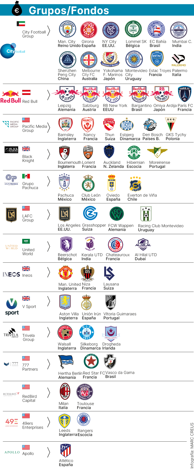 A medida que la propiedad se concentra, crece otra derivada: la multipropiedad. City Football Group agrupa al Manchester City, el Girona, el New York City, el Palermo y el Troyes francés, entre otros. RedBird controla el Milán, el 85% del Toulouse y está vinculado al ecosistema de Fenway Sports Group (Liverpool). El fondo estadounidense 49ers Enterprises es dueño del Leeds y el Rangers, el británico V Sport controla el Aston Villa, el Vitoria de Guimaraes y el Real Unión de Irún o Black Knight el Bournemouth inglés, el Lorient francés, el Hibernian escocés o el Moreinense portugués. Muchos de estos fondos también han dado el salto a América Latina, Japón o incluso geografías con menos tradición futbolística como China, India, Australia o Nueva Zelanda.