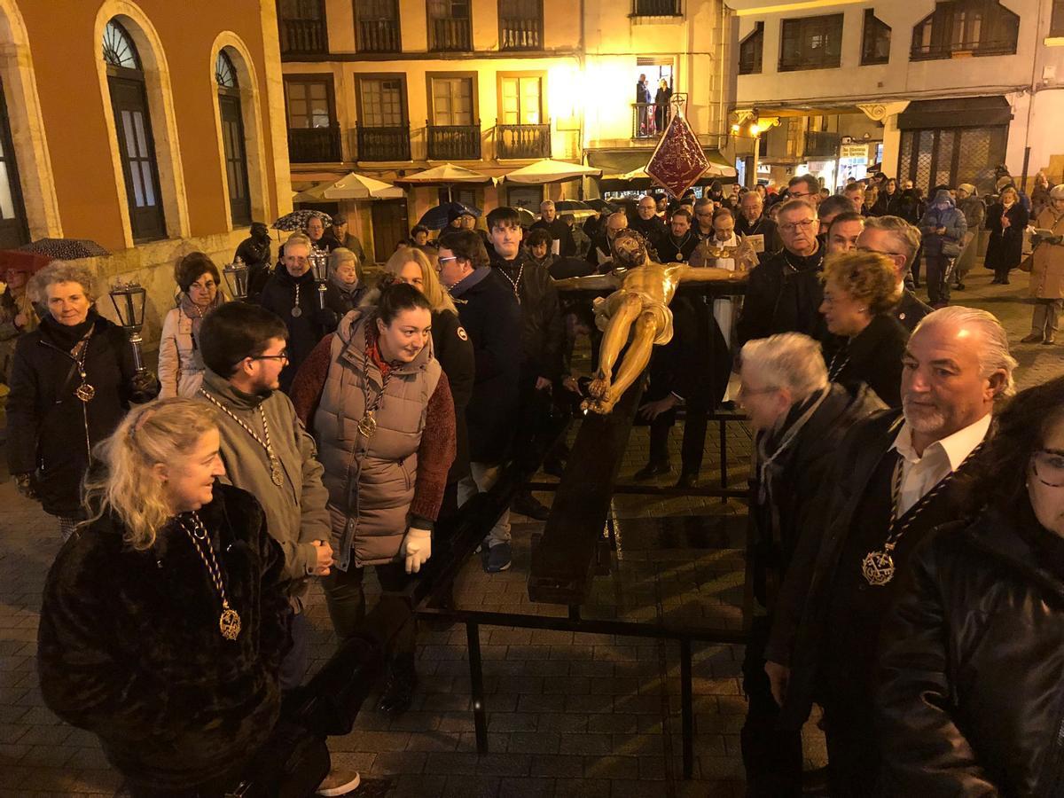 La Junta de Hermandades y Cofradías de Semana Santa de Oviedo recorre esta tarde noche, primer viernes de Cuaresma, las calles de Oviedo en un Vía Crucis que ha salidode la iglesia parroquial de San Isidoro a las 20.00 horas. Durante las 14 estaciones de la oración penitencial pasan por Trascorrales, la calle Mon, la Corrada del Obispo, el Tránsito de Santa Bárbara, la plaza de la Catedral, la capilla de la Balesquida y retornarán por la calle Rúa y Cimadevilla al punto de partida, en San Isidoro. La imagen del Cristo de la Buena Muerte preside el Vía Crucis, en el que participan cofrades de todas las hermandades ovetenses.