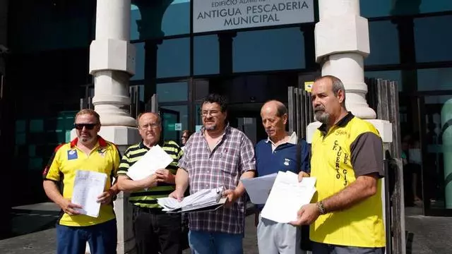 Directivos y simpatizantes del C. F. Puerto de Gijón entregan las firmas esta mañana en el Ayuntamiento de Gijón. / Juan Plaza