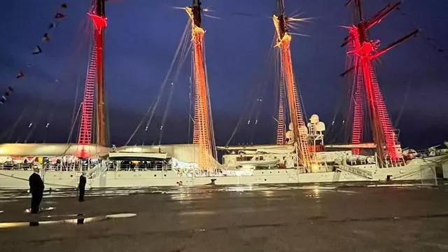 El buque, iluminado con los colores de la bandera nacional, acoge una cena para autoridades