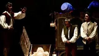 El teatro Jovellanos acogió el pasado sábado la representación de la obra de Quevedo "Polvo serán, mas polvo enamorado", que fue representada por el grupo "Morfeo Teatro", interpretada por Francesc Albiol, Francisco Negro, Mayte Bona, Felipe Santiago y Santiago Nogués. La trama de esta obra se construye en torno al entierro de un cómico por parte de sus compañeros de farándula y la visita de la muerte, que viene a llevárselo, cuando en un momento dado el cómico vuelve en sí, ya que no estaba muerto, sino que debido a una borrachera se había quedado dormido en el ataud. En la imagen, un momento de la obra.