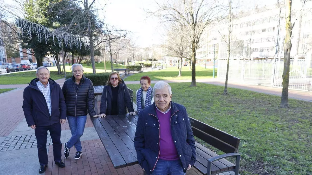 Alejandro Romero, en primer término, junto a varios vecinos de Contrueces, en el parque de las Palmeras. / Marcos León