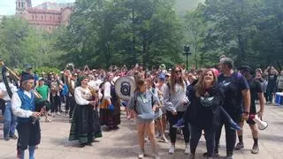 Actividad solidaria en Covadonga de "El ángel de Javi", que aparece en primer término a la derecha con su madre, cargado a su espalda, el pasado mayo. / J. M. CARBAJAL
