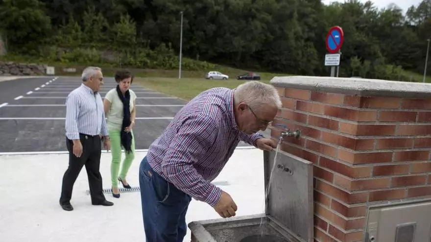 El edil José Manuel Álvarez bebe agua en el área de autocaravanas, con María y Vicente Fernández detrás. / F. R.