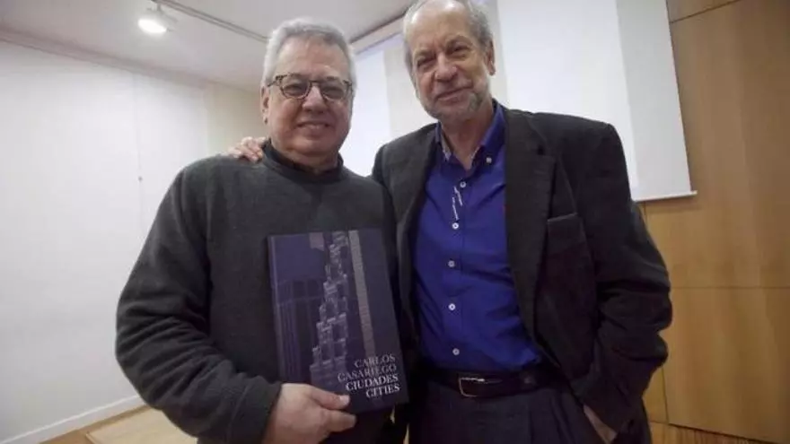 El pintor y fotógrafo Carlos Casariego (Oviedo, 1952) presentó ayer en el Colegio de Arquitectos de Asturias el libro "Ciudades/Cities", su último trabajo artístico personal en el que reúne parte de su obra gráfica en torno al paso del tiempo, los espacios urbanos y sus gentes, tomadas en ciudades como Nueva York o La Habana, pero también Oviedo y Gijón. En la imagen, el artista con el decano del Colegio, Alfonso Toribio.