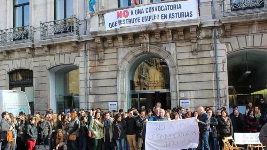 En la concentración de la Corrada del Obispo, profesores y alumnos mostraron pancartas en las que se leía "No a una convocatoria injusta", "Solo Asturias no protege a sus trabajadores", "No a la exclusión de funcionarios asturianos", "Interinos asturianos a la calle" y "No a una convocatoria que destruye empleo en Asturias".