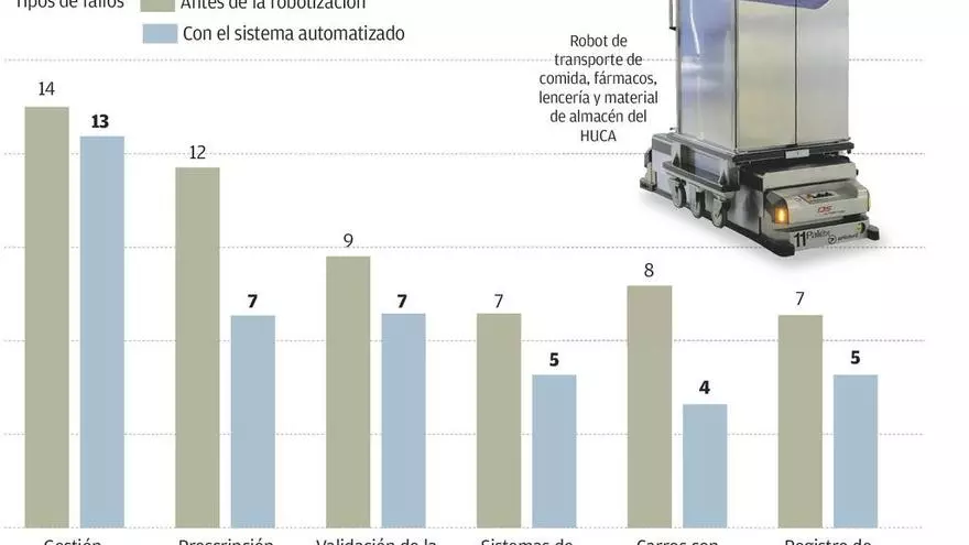 En ese análisis por departamentos, una de las conclusiones principales es que en el proceso de prescripción de medicamentos, donde se ha introducido una nueva historia clínica electrónica, es donde más se ha mejorado, pasando de 12 tipos de fallo a sólo 7. Al revés, el área donde la robotización parece que ha tenido menos incidencia es en el de gestión y adquisición de medicamentos, que incluye la robotización del almacén, donde la reducción de los puntos críticos en los que se producen errores sólo se ha pasado de 14 a 13.