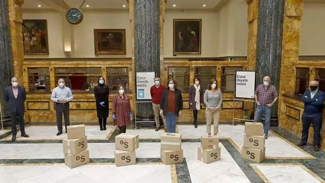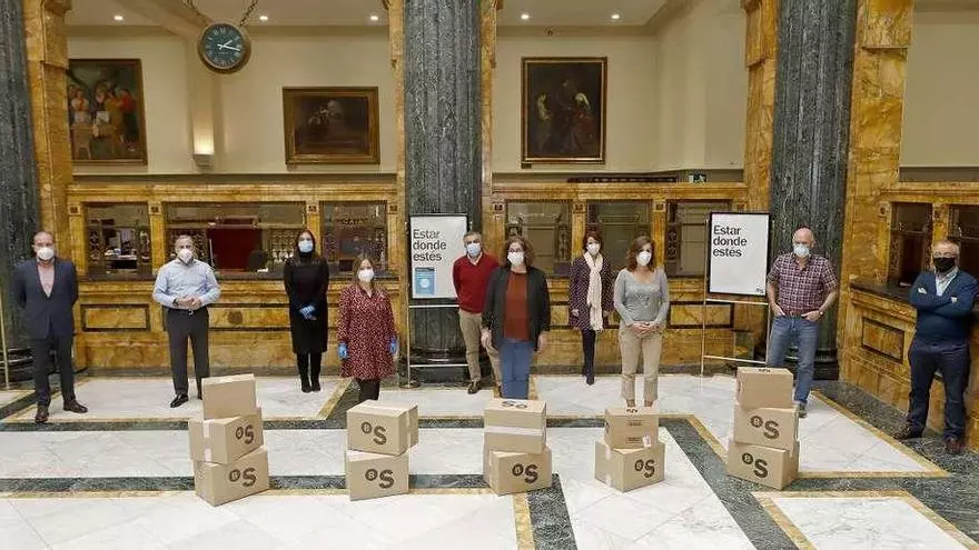 Los empleados del Banco Sabadell en Asturias, León y Galicia han promovido una campaña de recaudación de fondos que ha conseguido reunir 9.000 euros para Cáritas diocesana de Oviedo, que se destinarán a la compra de tabletas y otros materiales informáticos para ochenta familias (120 adultos y 140 niños) en riesgo de exclusión social y pobreza atendidas por el programa de menores y familia. Con esta aportación, la organización ayudará a mitigar la brecha digital. Los técnicos de Cáritas habían detectado esta necesidad al tratar con diversas familias durante el confinamiento. En la imagen, personal en la sede del banco con la donación.