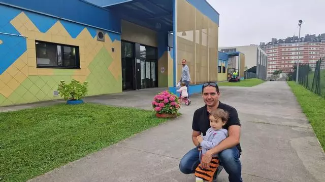 Álvaro Aguilar posa con su hijo Gonzalo delante de la escuelina del Rubín, en Oviedo.