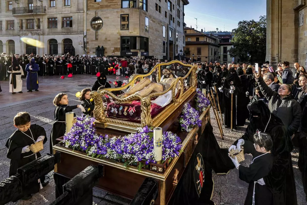 Oviedo se sumió este Viernes Santo en su silencio más respetuoso para acompañar a la Real y Trinitaria Archicofradía del Santo Entierro y Nuestra Señora de los Dolores en su Inmaculada Concepción. En una tarde donde la sobriedad fue la nota dominante, miles de personas —entre fieles, turistas y curiosos— se agolparon en las aceras del casco histórico para asistir a una de las estaciones de penitencia más solemnes de la Semana Santa ovetense.