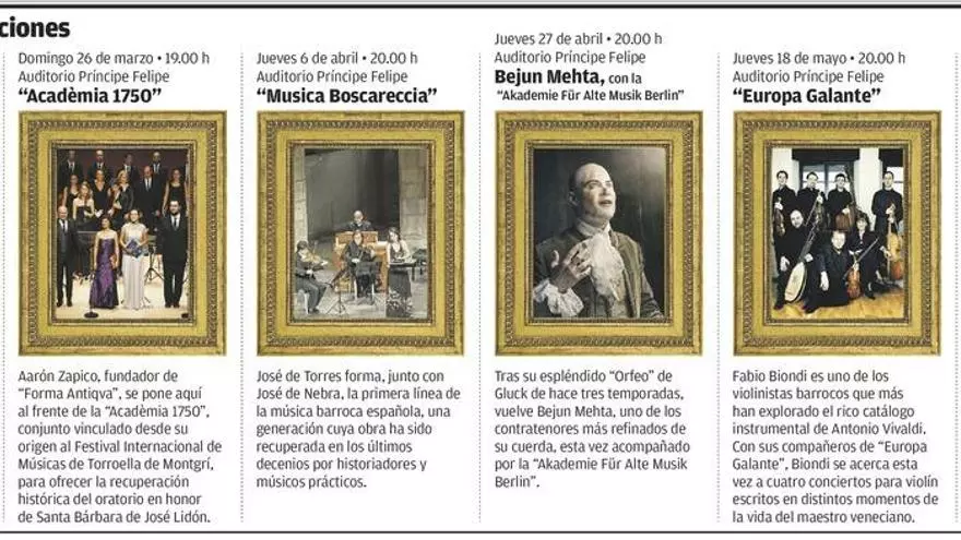 Jordi Savall y "Hespèrion XXI" proponen un viaje de Oriente a Occidente a través de la música, y es que su actuación en Oviedo recogerá música tradicional sefardí, israelí y afgana, junto a obras del compositor español Diego Ortiz y del violagambista Marin Marais. El violinista italiano Fabio Biondi es uno de los mayores conocedores de la obra de Antonio Vivaldi. En Oviedo ofrecerá un recorrido por los conciertos para violín del autor veneciano, entre ellos el "Rv 222 'dedicato alla signora Chiara' ", aunque también la viola de amor y el laúd tendrán su espacio en el programa que Biondi propone junto a su agrupación "Europa Galante".